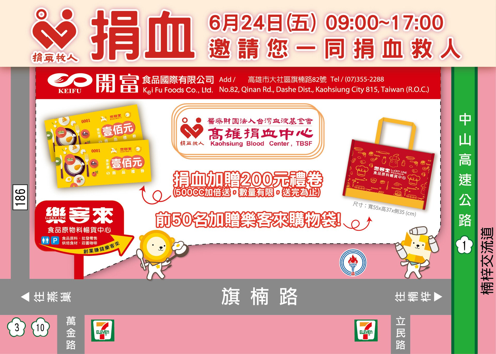 近期受到疫情影響,導致血庫存量銳減,開富食品與高雄捐血中心攜手合作舉辦愛心捐血活動。當日捐血者即可獲得樂客來食品暢貨中心禮券!前50名再加贈樂客來超大環保購物袋!捐血一袋,鄉里有愛!邀請您一同參與讓愛延續!